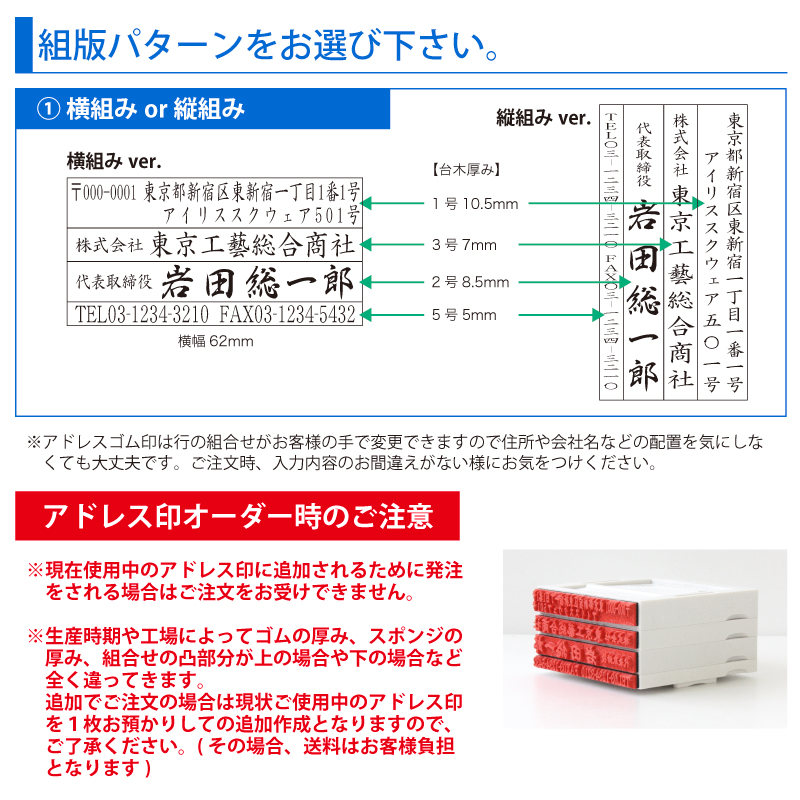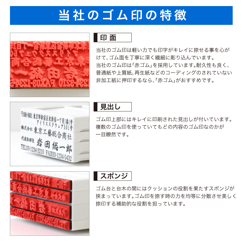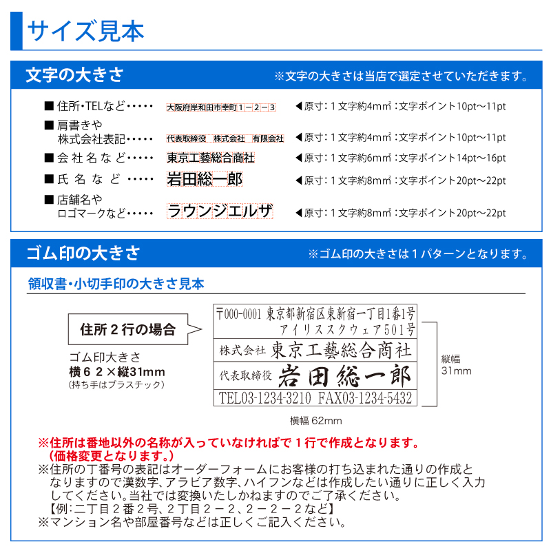 領収書用や小切手用、封筒などのリターンアドレスに捺せる使い勝手が良いゴム印です。